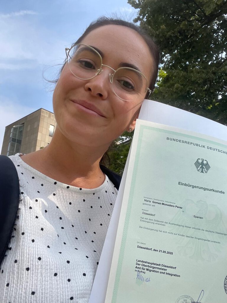 Soy española y vivo en Düsseldorf desde 2020, aunque llevo en Alemania de forma ininterrumpida desde finales de 2017. En junio de 2022 me casé con un alemán, y en septiembre de 2024 decidí —por fin— iniciar los trámites para solicitar la nacionalidad alemana por naturalización (Einbürgerung).